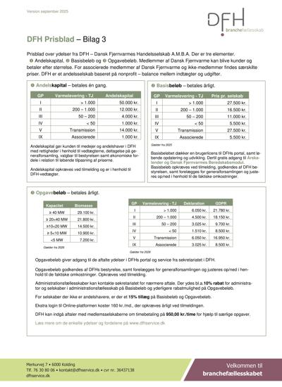 Andelsbeløb: DFH er et andelsselskab, derfor vil alle medlemsselskaber betale en andelskapital ved indmeldelse. Det er kun én gang, og beløbet tilbagebetales ved eventuel udmeldelse.
