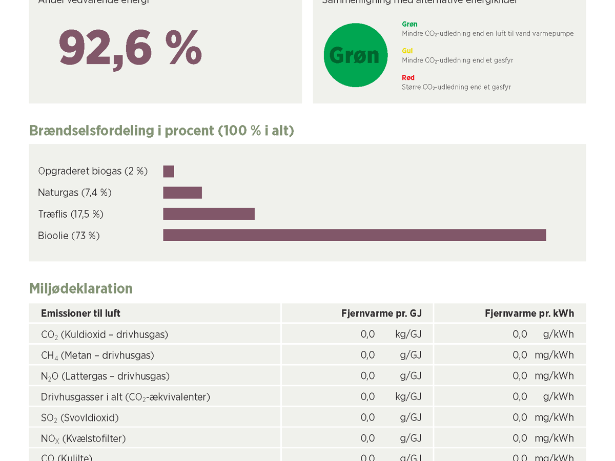 - Andel vedvarende energi, brændselsfordeling og emissioner til luft skal fremgå af deklarationen.