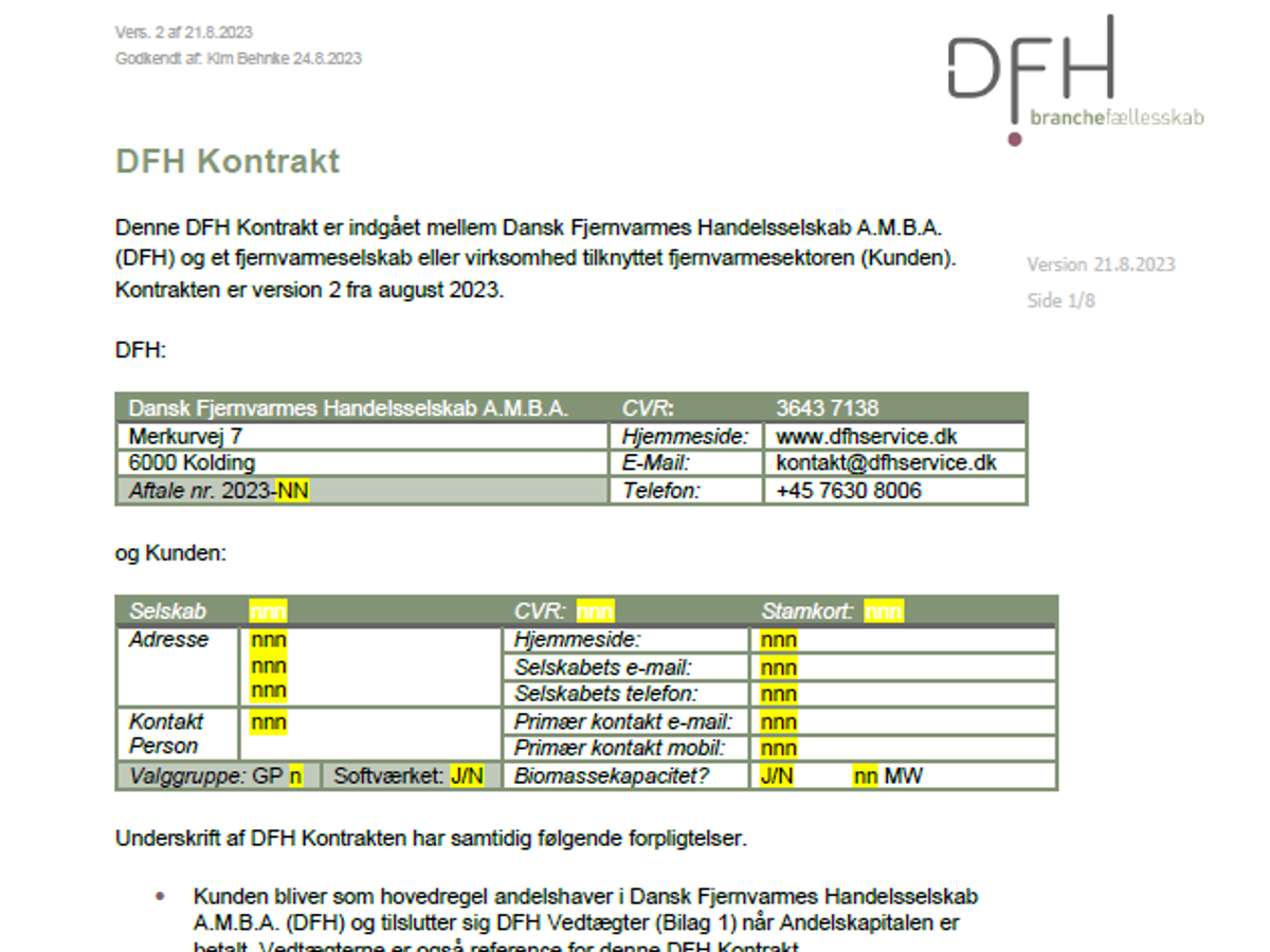 DFH har en standardkontrakt for medlemsselskaberne. Til kontrakten er der seks bilag. Disse kan ses her.